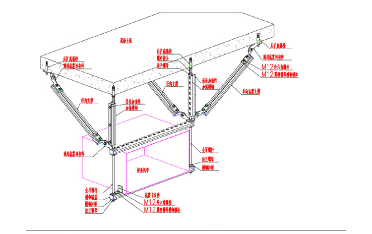 管道抗震支架一般分為側(cè)向抗震支吊架和側(cè)縱向抗震支吊架。一般采用膨脹錨栓、全螺紋螺桿、連接構(gòu)件、角鋼或C型槽鋼和U型管夾,支吊架間距可根據(jù)實(shí)際情況調(diào)整,不大于規(guī)定的安裝間距。